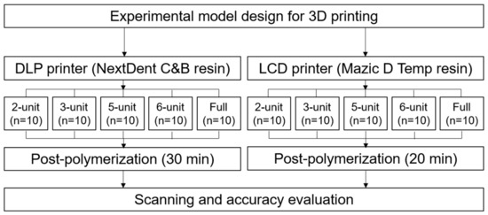Although producing precise temporary restorative materials through 3D printing is critical, there have been a lack of studies regarding its accuracy. Few studies have been performed on 3D-printed temporary restorations, including the cytocompatibility of 3D-printed temporary restorations [8] and fabrication of highly viscous temporary crowns with fast building speed [9]. In addition, comparisons on the products of DLP and LCD-type printers have hardly been made. One study showed that DLP and LCD-type printers could print products of similar mechanical and biological properties if several adjustments in polymerization time and intensity were performed [6]. Therefore, it may be necessary to print temporary restorations using commonly used DLP and LCD techniques and study their accuracy. As the accuracy may vary according to size, variations in sizes may also be needed.