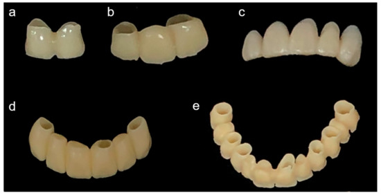Representative printed restorations. (a) 2-unit, (b) 3-unit, (c) 5-unit, (d) 6-unit, and (e) full-arch restorations.