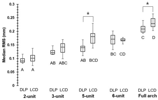 Median RMS of whole deviation; asterisks show significant difference within the same unit, whereas different uppercase letters (A–D) show significant difference within the same printers (p < 0.05).