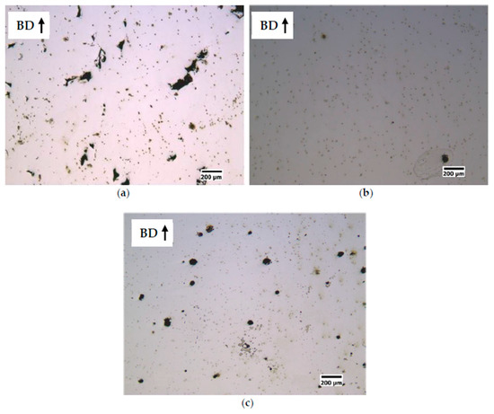 Micrographic analysis of porosity showed that low specific laser energy E (Jm−1) results in the formation of irregularly shaped pores (Figure 6a and Figure 7a for S1-FeSi3 and S1-FeSi6.5 samples, respectively). This particular shape can be associated with empty spaces among not perfectly melted powder particles. The relative density of the S1 sample was the lowest among all the samples for both steels, 99.93% and 99.96%, respectively for FeSi3 and FeSi6.5. Conversely, with a high specific laser energy E [Jm−1], the pores assume a spherical shape (Figure 6c and Figure 7c for S18-FeSi3 and S18-FeSi6.5 samples, respectively).