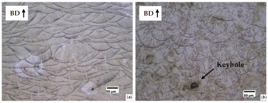 Example of transition from conduction melting to keyhole formation. (a) optical micrograph of the longitudinal section to the build direction (BD) of S1-FeSi6.5 sample (E = 150 Jm−1, v = 0.5 ms−1, P = 75 W), conduction melt mode; (b) optical micrograph of the longitudinal section to the build direction (BD) of S18-FeSi6.5 sample (E = 350 Jm−1, v = 0.5 ms−1, P = 175 W), keyhole mode.