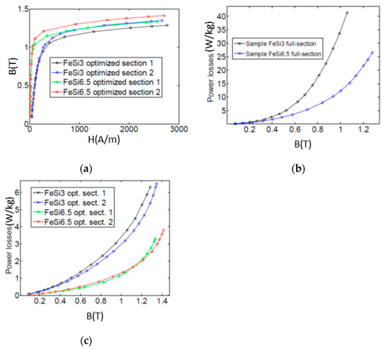 The eddy current effects are clearly visible in the full-section samples where the areas of the loops are very large because of the high power losses. These effects result in being strongly mitigated in case of the samples with the optimized sections. The FeSi6.5 samples show less eddy current effects in comparison with the FeSi3 samples, this fact resulting in the higher magnetization capability (see Figure 14a) and reduced power losses over 50% (see Figure 14b,c). The sample in FeSi6.5 with optimized section type 2 shows the best performances, although still far from the commercial FeSi laminated cores; for instance, the power losses result in being about two times higher in comparison with commercial cores of non-oriented FeSi 3% steel made of sheets of 0.35 mm thickness [52].