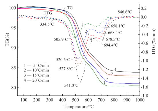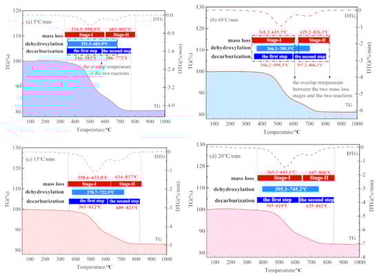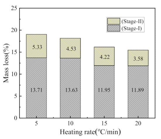 The mass losses in the first stage were 13.71 wt.%, 13.63 wt.%, 11.95 wt.%, and 11.89 wt.%, corresponding to the heating rates of 5 °C/min, 10 °C/min, 15 °C/min, and 20 °C/min, respectively. The average value of the first stage at these four heating rates is 12.80 wt. %. The second stage mass losses were 5.33 wt.%, 4.53 wt.%, 4.22 wt.%, and 3.58 wt.%, with an average value of 4.42 wt.%. The first stage mass loss is about three times that of the second stage, indicating that the first stage reaction is the dominant one. As the heating rate increases, the mass loss decreases, which is similar to the phenomenon reported in the literature [30]. This phenomenon can be explained from the perspective of heat transfer. With the increase in heating rate, the time needed to reach a specific temperature is shortened. Thus, the material with larger particles is not evenly heated, resulting in the reduction of the degree of reaction [31,32].