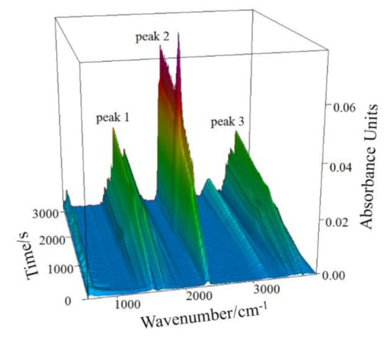 Figure 4 presents the infrared absorption spectrum (3D) of gaseous products released in the thermal analysis at the 10 °C/min heating rate. The results of infrared spectrum analysis of gaseous products at different times are shown in Figure 5.