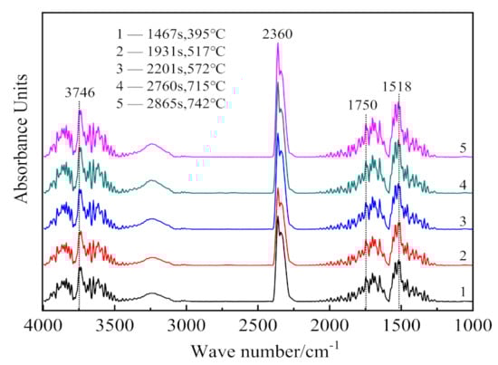 In Figure 5, the infrared absorption at 3700 cm−1 is associated with the inner-surface O-H stretching, and that at position 3660 cm−1 is attributed to the inner-cage O-H stretching of kaolinite [33]. The hydroxyl groups bending vibrations exist at 1518 cm−1 and 1750 cm−1 [34]. Asymmetrical stretching and bending vibrations of CO2 occur at 2360 cm−1 [35]. Thus, the infrared absorption of gaseous products released during the CSK calcination is mainly due to O-H and C-O groups. As the major mineral phases in the sample are kaolinite, boehmite, and calcite, it can be concluded that the gaseous products of CSK calcination are H2O(g) and CO2. Comparing Figure 4 with Figure 5, peak 1 and peak 3 in Figure 4 correspond to the absorption of H2O(g), and peak 2 corresponds to the absorption of CO2.