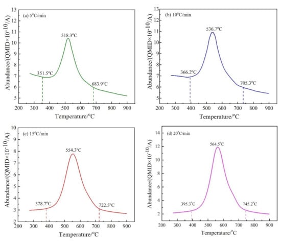 The release intensity (abundance) curves of M/z = 44 at different heating rates. (a) 5 °C/min; (b) 10 °C/min; (c) 15 °C/min; and (d) 20 °C/min. *QMID in the figure is the abbreviation of “quasi multi-ion detection”.