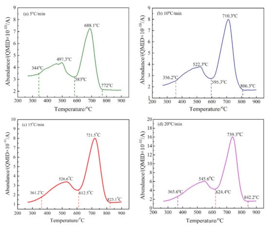 The release intensity (abundance) curves of M/z = 18 at different heating rates. (a) 5 °C/min; (b) 10 °C/min; (c) 15 °C/min; and (d) 20 °C/min.