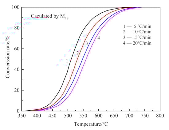 The kinetics of dehydroxylation and decarburization in CSK calcination were analyzed from MS data. The conversion curve for dehydroxylation of CSK is shown in Figure 9, calculated from MS curves in Figure 6 by Equation (6).