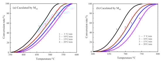 There are two peaks in the release intensity curve of M44 at different heating rates (as shown in Figure 7), indicating that the decarburization of CSK was a two-step reaction. The temperature range of the first step decarburization was roughly 350–620 °C, and that of the second was 580–840 °C. The carbon found in CSK samples mainly comes from coal and a small amount of calcite. As the decomposition temperature of calcite is higher than 800 °C, the two-step reaction displayed the actual characteristics of CSK decarburization [36]. The peak area on the right side of the curves in Figure 7 was much larger than that on the left side, indicating that the second step reaction was the major CSK decarburization stage.