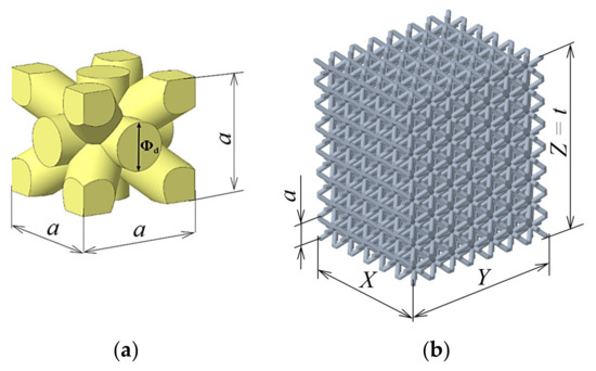 To investigate the relationship between mechanical vibration and pressure properties, a simple BCC (body-centered cubic) cell with cylindrical struts was chosen (Figure 1a). This cell was regularly “distributed” in all three directions, x, y, and z, by shifting by the entire cell size. Within the research, the samples were made with three basic cell sizes a = 5, 7, and 10 mm. The dimensions of the individual experimental specimens were controlled by the relation X × Y × Z = 6a × 7a × 8a, which means that the samples with the cell size a = 5 mm had dimensions of 30 mm × 35 mm × 40 mm, samples with the cell size a = 7 mm had dimensions of 42 mm × 49 mm × 56 mm, and samples with the cell size a = 10 mm had dimensions of 60 mm × 70 mm × 80 mm.