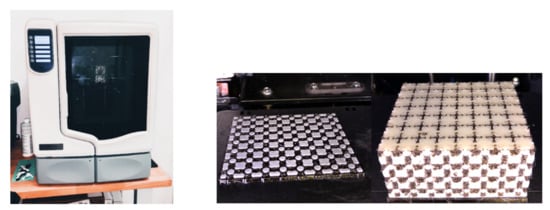 The samples were produced by the FDM (fused deposition modeling) technique employing the 3D printer uPrint SE (Computer Aided Technology, Buffalo Grove, IL, USA), which uses the soluble supports technology (SST). It is a water-based solution that allows to simply wash away the support material used in the 3D printing process of a component. The part is left smooth and clean with the fine details intact in that case. After removing the sample from the printer, the sample was placed in a cleaning device, where the support material was removed (dissolved) by flowing in the aqueous solution at 70 °C. Because the samples were complex in shape and contained a relatively large amount of supporting material, it was necessary to add to the hot water a solution of SR-100 containing small particles of so-called dust, which ensures faster solubility of the support material. The layer thickness was 0.254 mm. During sample production, all other process parameters were retained as set by the 3D printer manufacturer for ABS material because the machine does not allow the settings to be changed. The 3D printer uPrint SE and two views of the sample in the printing process are shown in Figure 3, where it is possible to see the alternating layering of the basic and support material (black colored).