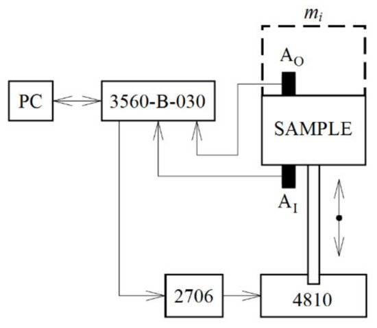 Experimental measurements of the displacement transmissibility of the investigated 3D-printed open-porous ABS materials were performed using harmonically excited vibrations in the frequency range of 2−3000 Hz. The schematic diagram of the measuring device for measuring the vibration damping properties of a linear single-degree-of-freedom (SDOF) system are shown in Figure 4. The measuring device consisted of a mini-shaker (BK 4810), a dynamic signal PULSE multi-analyzer (BK 3560-B-030) (Brüel & Kjær, Nærum, Denmark), and a power amplifier (BK 2706) (Brüel & Kjær, Nærum, Denmark). The mini-shaker type 4810 is a compact, permanent magnet, electrodynamic exciter with a maximum force ratio of 10 N. In the case of the harmonically excited mechanical vibrations, it is possible to modify Equation (2) as follows: