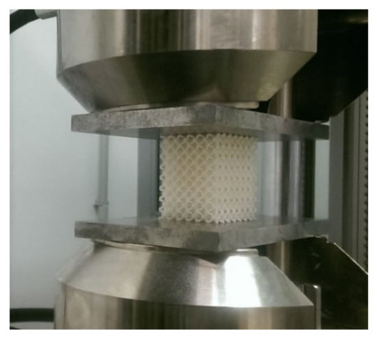 Uniaxial quasi-static compression tests over the entire range (up to failure) were performed on all investigated grating specimens in the laboratory of the University of Tomas Bata (Zlin, Czech Republic) using a Zwick 1456 testing device (ZwickRoell GmbH & Co. KG, Ulm, Germany) according to the ISO 844 standard [35] at an ambient temperature of 21 °C and a crossbar feed rate of 1 mm/min. The force was measured by the load cell of the testing machine, and the displacement of the machine plate was used to determine the axial strain in the specimen. A view of a specimen during a compression test is shown in Figure 5.