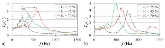 The volume ratio (or the relative density) of porous materials has a significant influence on their mechanical properties. The mechanical stiffness of porous structures increases with decreasing porosity and pore sizes, which is a typical property of porous materials [36,37,38,39,40]. Figure 6 demonstrates the influence of the volume ratio Vr on the frequency dependencies of the displacement transmissibility Td. It is evident that the displacement transmissibility increased with an increase in the sample volume ratio (or in its stiffness). For this reason, the vibration damping properties of the investigated ABS samples decreased with an increase in the sample volume ratio, which was reflected in a shift of the first resonance frequency peak position (fR1 ≈ Tdmax) to higher excitation frequencies. This finding is consistent with Equations (3) and (5), when the first resonance frequency generally increases with a decrease in the damping ratio ζ and with an increase in the sample stiffness k. For example, in the case of the ABS sample, which was produced with a cell size a = 7 mm and loaded by an inertial mass mi = 90 g (see Figure 6a), the first resonance frequency fR1 increased from 226 Hz (for Vr = 25 %) to 585 Hz (for Vr = 70 %). Similarly, the first resonance frequency fR1 increased from 221 Hz (for Vr = 25 %) to 615 Hz (for Vr = 70%) in the case of the unloaded ABS sample (i.e., without the inertial mass) whose structure contained cells of 10 mm in size (see Figure 6b). The measured values of the first resonance frequency for the tested ABS samples, which were produced with three different cell sizes and volume ratios and loaded by three different inertial masses, are presented in Table 2.