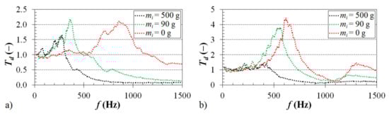 The inertial mass mi, which is placed on top of the harmonically tested ABS samples (see Figure 4), has a significant influence on the displacement transmissibility, and thus on the vibration damping properties. The effect of the inertial mass on the frequency dependencies of the displacement transmissibility is depicted in Figure 7. It is evident from the displayed frequency dependencies that the inertial mass has a positive effect on the displacement transmissibility, which is reflected in a shift of the first resonance frequency peak position to lower excitation frequencies. As shown in Figure 7a, the first resonance frequency decreased from 848 Hz (for mi = 0 g) to 266 Hz (for mi = 500 g) in the case of the ABS sample whose structure was produced with a volume ratio of 25% and a cell size of 5 mm. The first resonance frequency of the ABS sample, which was produced with a volume ratio of 70% and a cell size of 10 mm, exhibited a decrease from 615 Hz (for mi = 0 g) to 225 Hz (for mi = 500 g), as demonstrated in Figure 7b. It was confirmed that a higher inertial mass generally leads to a decrease in the natural frequency ωn (see Equation (4)), and thus to a decrease in the first resonance frequency [41]. It should be noted that the magnitude of inertia load is limited only to the range of elastic deformations of the harmonically loaded ABS samples.