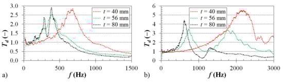 It is evident that a higher sample thickness generally results in a better ability to dampen mechanical vibration [42,43]. This is accompanied by a decrease of the first resonance frequency (see Table 2) from 682 Hz (for t = 40 mm) to 381 Hz (for t = 80 mm). This is caused by higher internal friction during the propagation of the mechanical wave through the tested open-porous ABS material structures, and thus by a higher dissipation of the mechanical energy into heat during dynamic loading of these samples. A similar effect of the material’s thickness on the displacement transmissibility was observed for the ABS samples without the inertial mass (mi = 0 g, Figure 8b), which were manufactured with a volume ratio of 70%. In this case (see Table 2), the first resonance frequency decreased from 2197 Hz (for t = 40 mm) to 615 Hz (for t = 80 mm).