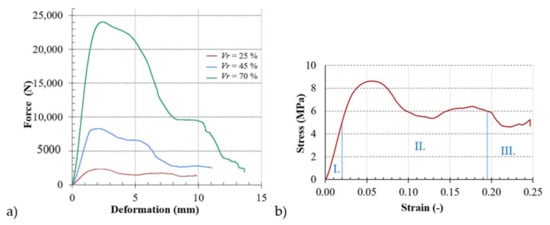 Engineering dependences: (a) load vs. displacement of the samples with a = 5 mm and Vr = 25%, 45%, and 70%; (b) stress vs. strain curve of the sample with a = 5 mm and Vr = 25% with regions I. almost linear elastic region, II. constant plateau region, and III. densification area.
