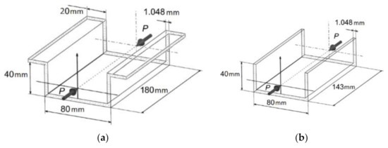 The subject of the study was thin-walled top-hat and channel section composite structures made of CFRP material with the use of autoclave technique. The manufacturing process of specimens took place in a hermetic vacuum package in sterile conditions. The composite structure making method allowed for manufacture specimens with low porosity, high repeatability, and high strength properties [56]. The thin-walled composite columns were made of pre-preg (semi-finished components). The manufacturing process of composite specimens was presented in detail in the work [56]. The specimens consisted of eight layers (equal thickness) with symmetrical arrangement [45/–45/90/0]s relative to the central laminate plane. The geometrical parameters of the specimens are shown in Figure 1.