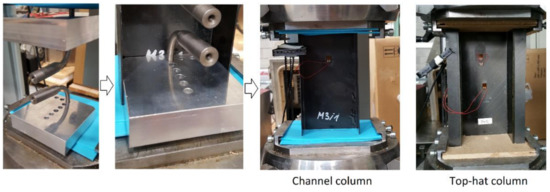 In the presented work, the experimental study (EXP) of axial compression tests of thin-walled top-hat and channel section composite columns in full load range (up to loss of load-carrying capacity) were carried out. The axial compression was achieved with a constant cross-bar speed of 2 mm/min, at room temperature. In the experimental study, steel centering inserts were used in order to set the composite structure at the center of gravity. Additionally, special supports (plastic—for channel column, plywood—for top-hat column) were used in order to reduce any geometrical imperfections of end sections of actual specimens. Experimental tests were carried out using a UTM—Zwick Z100. The experimental study registered shortening, compressive force, and increase in deformation of the column (measured using the electrofusion strain gauges (Micro-Measurements, Raleigh, NC, USA), in the perpendicular direction to the web of composite structures, in the region of the largest deflections). Moreover, the acoustic emission method—AEM (registered: energy, amplitude, sum of hits, and number of counts) [29]—using the AMSY-5 device (Vallen Systeme GmbH, Icking, Germany) with special piezoelectric Fujicera sensor 1045S and AEP-4 signal amplifiers was used. An important objective of the conducted study was to determine post-critical equilibrium paths, which allows to predict the behavior of the composite columns subjected to axial compression. The test stand is shown in Figure 2.