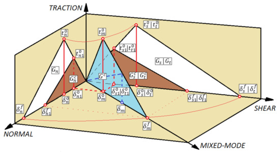 where: GC defines the total critical fracture energy (in case of the mixed-mode behavior); , , define the critical fracture energies in normal, first and the second shear directions; GS denotes the portion of the total work (associated with shear traction and relative displacement); GT denotes total work (associated with normal and shear traction) and η denote a material parameter.