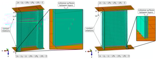 Regarding the prepared numerical models, a Continuum Shell model was used. All composite layers were modeled separately with each layer having a thickness of 0.131 mm. The orthotropic properties of each of the composite layers were declared. The numerical models were prepared using special type of finite elements (SC8R). Each of the finite elements had eight nodes (with three translational degrees of freedom, linear shape function and also reduced integration). Additionally, two non-deformable plates (representing supports of end sections of the composite structures) were modeled. The above-mentioned plates were designed using non-deformable Shell finite elements (R3D4). Each of the non-deformable finite elements have four computational nodes (containing three translational degrees of freedom). The discrete model of top-hat column had 13,296 finite elements and 27,342 nodes. For the discrete model of channel column, 8478 finite elements and 17,432 nodes were used. The reduced-density mesh used in the discrete models allowed numerical calculations to be performed without rapid loss of convergence as it is often the case with high-density mesh models. Regarding the numerical models, seven cohesive zones (cohesive surfaces) were implemented between eight laminate layers. The cohesive surfaces were introduced based on the parameters shown in Table 2. Additionally, between plates (constituting the supports for the end sections of the composite specimens) and the composite structure, the contact interactions were implemented—the tangential (with friction coefficient equal 0.2) and normal behavior. In the case of non-deformable plates, all boundary conditions were determined using reference points. The boundary conditions of the properly prepared numerical models are presented in Figure 4. A detailed description on the preparation of discrete models of thin-walled composite structures was presented in works on the subject literature [25,45].