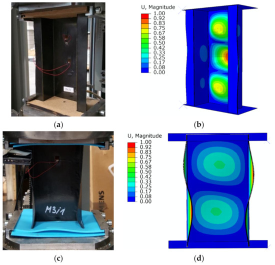 All numerical investigations were conducted using the finite element method (FEM) in ABAQUS® software (Abaqus 2021, Dassault Systemes Simulia Corporation, Velizy Villacoublay, France). The numerical studies were conducted in two stages, with the first stage being solely the solution of the linear eigenproblem [57]—to determine the lowest buckling form corresponding to the experimental study.