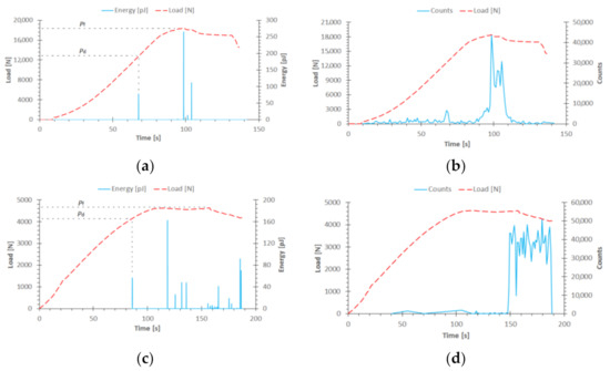 Regarding the above, the values of these loads (limit loads) were determined on the basis of the force-time characteristics. Additionally, selected acoustic emission signals were used to determine the values of the discussed loads.
