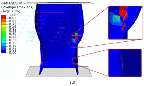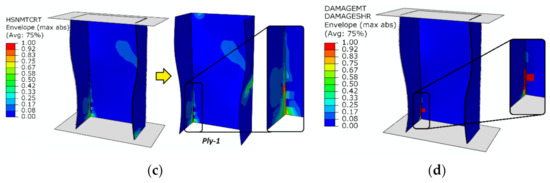 Damage initiation and evolution (PFA)—envelope result from eight laminate plies: (a) damage initiation of top-hat column—HSNMTCRT; (b) damage evolution of top-hat column—DAMAGEMT and DAMAGESHR; (c) damage initiation of channel column—HSNMTCRT; (d) damage evolution of channel column—DAMAGEMT and DAMAGESHR.