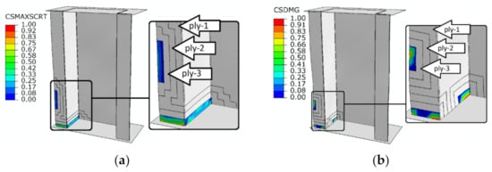 Based on the presented results for top-hat and channel columns, the damage initiation was directly evidenced by the first local observed “peak” of energy signal, which was approximately 75 pJ (at a time equal to 68 s) for top-hat column—Figure 6a, and 60 pJ (at a time equal to 85 s) for channel column—Figure 6c. A slight increase in the number of counts signal was also observed during the occurrence of the first energy “peak”. The acoustic emission signal presented in Figure 6b,d shows only the local increase in the signal (counts) in the time when the failure occurred and a significant increase in the signal was noted in its final phase—during the loss of the load capacity of the columns. The value of registered damage initiation load is Pd/EXP = 12,879.5 N for top-hat column and Pd/EXP = 4141.2 N for channel column. The value of the failure load was determined on the basis of the maximum value, which was registered during the experimental tests. During those tests a rapid increase in acoustic emission signals was recorded. The maximum registered load—failure load equaled Pf/EXP = 18,450.1 N for top-hat column and Pf/EXP = 4631.17 N for channel column. Regarding the experimental study, the damage initiation and failure loads for the top-hat column were a few times higher than for the channel column: 3.11 times higher in the context of damage initiation load and 3.98 times higher in the aspect of load causing loss of load-carrying capacity. During the parallel numerical simulations damage initiation and evolution were carried out with two damage models (PFA, CZM). In the first damage model, which was based on PFA, the damage initiation depended on Hashin criterion and damage evolution on energy criterion—Figure 7.