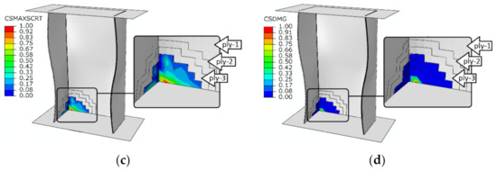 Damage initiation and evolution (CZM) caused by delamination: (a) damage initiation of top-hat column—CSMAXSCRT; (b) damage evolution of top-hat column—CSDMG; (c) damage initiation of channel column—CSMAXSCRT; (d) damage evolution of channel column—CSDMG.
