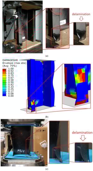 Regarding the performed study, a high compliance between the experimental study and numerical simulations was observed [66,67,68,69,70,71,72,73,74]. Furthermore, the qualitative results of conducted investigations are presented in Figure 10 (including progressive delamination).