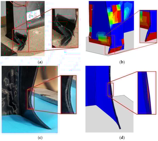 Qualitative assessment of loss of load-carrying capacity (including delamination): (a) top-hat column EXP; (b) top-hat column FEM; (c) channel column EXP; (d) channel column FEM.