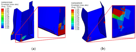 Obtaining a value of 1, indicating the fulfillment of the first component of damage initiation by HSNMTCRT, constituted the beginning of damage initiation. This occurred at a load that equals Pd/FEM-PFA = 13,567.66 N for top-hat column and Pd/FEM-PFA = 4303.36 N for channel column. The first layer to be damaged was the first external layer of the composite material (presented directly on Figure 7a,c). Further numerical analysis allowed for evaluation of the damage evolution phenomenon. Damage analysis in the context of damage evolution confirmed the progression of damage due to matrix tension which in the case of damage evolution corresponds to the DAMAGEMT parameter (at the same time the shear damage component DAMAGESHR was fulfilled). The damage evolution occurred at the load that equals 18,422.9 N for the top-hat column and 4370.93 N for the channel column. The fulfillment of the damage evolution within the first component was not the reason for the loss of load-carrying capacity of the composite structures.