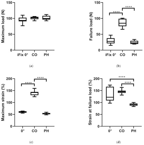 Boxplots showing mean and standard deviation (box) as well as range (whiskers) of the three groups under investigation, iFix, CO and PH: (a) Comparison of the maximum load; (b) failure load; (c) maximum strain; (d) strain at failure load. (p < 0.033 *; p < 0.002 **; p < 0.002 ***, p < 0.0001 ****).