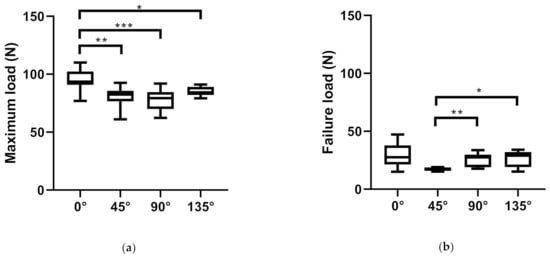 When comparing iFix in several orientations (0°, 45°, 90°, 135°) using the tensile test, a statistically significant higher maximum load could be found for iFix 0° in comparison to iFix 45° (p = 0.0021), to iFix 90° (p = 0.0002) and to iFix 135° (p = 0.0358) (Figure 3a). At the failure load, a statistically significant lower value could be found for iFix 45° in comparison to iFix 90° (p = 0.0053) and iFix 135° (p = 0.0201) (Figure 3b). Considering the strain at maximum load assessed in the tensile test, the highest value could be observed for iFix 90° and the lowest for iFix 0°. iFix 135° showed a statistically significant higher strain at maximum load than iFix 45° (p = 0.0245). All other comparisons for strain at maximum load were statistically significant (p < 0.0001) (Figure 3c). Assessing the strain at failure load, a statistically significantly higher value could be observed for iFix 135° in comparison to iFix 45° (p = 0.0395) (Figure 3d).