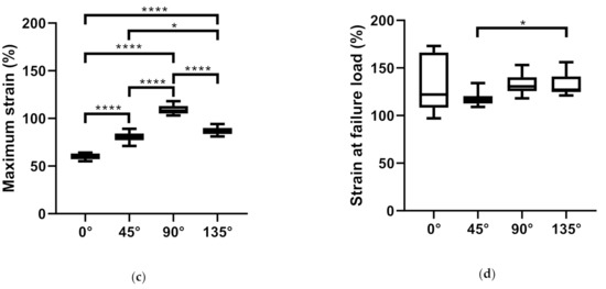 Boxplots showing mean and standard deviation (box) as well as range (whiskers) of the four different orientations of iFix (iFix 0°, iFix 45°, iFix 90° and iFix 135°). (a) Comparison of the maximum load; (b) failure load; (c) strain at maximum load; (d) strain at failure load. (p < 0.033 *; p < 0.002 **; p < 0.002 ***, p < 0.0001 ****).