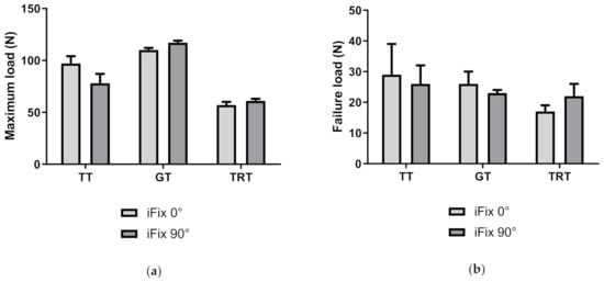 A statistically significantly higher value could be found for the maximum load (p = 0.0217), for failure load (p = 0.0209), for strain at maximum load (p < 0.0001) and for strain at failure load (p = 0.0002) in the transversal direction (iFix 90°) in comparison to the longitudinal direction (iFix 0°) using the tear resistance test (Table 3).