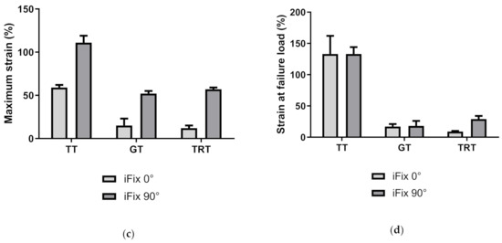 Mean and standard deviation of iFix in the longitudinal direction are shown for the three different test procedures (tensile test TT, grab test GT, and tear resistance test TRT). (a) Comparison of the maximum load; (b) failure load; (c) strain at maximum load; (d) strain at failure load.