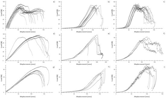 Load–displacement curves of (a) tensile test of iFix, (b) tensile test of CO, (c) tensile test of PH, (d) grab test of iFix, (e) grab test of CO, (f) grab test of PH, (g) tear test of iFix, (h) tear test of CO and (i) tear test of PH.