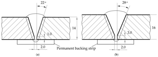 The design of butt joints: (a) in metal active gas (MAG) welding according to GOST 14771-76 in Russian; (b) in submerged arc welding (SAW) process according to GOST 8713-79 in Russian.