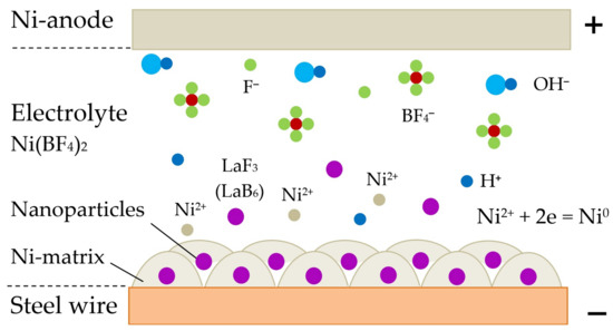 Affected by electrostatic forces, insoluble LaF3 or LaB6 nanoparticles are attracted and deposited on the surface of the wire having a negative charge. The nickel cations Ni2+ or copper cations Cu2+ from the electrolyte and from the anode are neutralized on the surface of the cathode and form a metal layer over nanoparticles. OH−, F−, BF4− anions, which move in the opposite direction, are neutralized on the surface of the nickel anode and contribute to its erosion and enrichment of the electrolyte by nickel cations Ni2+. Thus, in a fast process, the composite is formed from the metallic matrix and nanoparticles. In case the composite Cu-coating is formed in electrolyte, copper cations Cu2+ and anions SO4− appear from copper sulfate CuSO4, and pure copper is used as anode.