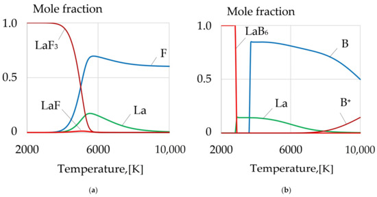 The mole fraction of components during dissociation: (a) LaF3; (b) LaB6.