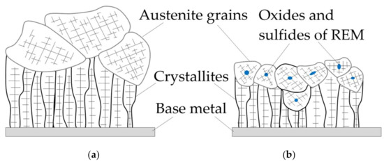 The model of dendritic crystallization at the boundary of “weld pool-base metal” transition: (a) without limiting the growth of crystallites; (b) with limiting the growth of crystallites involving additional crystallization nuclei, oxides, and sulfides.