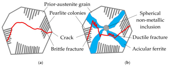 Cold crack propagation trajectory in prior-austenite grains: (a) without acicular ferrite; (b) with acicular ferrite nucleated on a spherical non-metallic inclusion.