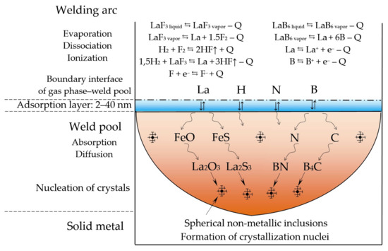The model of metallurgical processes occurring in the welding arc and weld pool as LaF3 and LaB6 are introduced is shown in Figure 8.