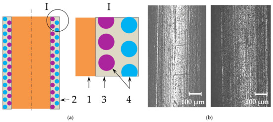 (a) The design of the composite wire: (1) solid wire, (2) composite coating, (3) metal matrix, (4) particles of rare earth compounds, (b) optical macrostructure of the surface of G3Si1 wire with Ni-LaF3 coating; (c) optical macrostructure of the surface of G3Si1 wire with Ni-LaB6 coating.