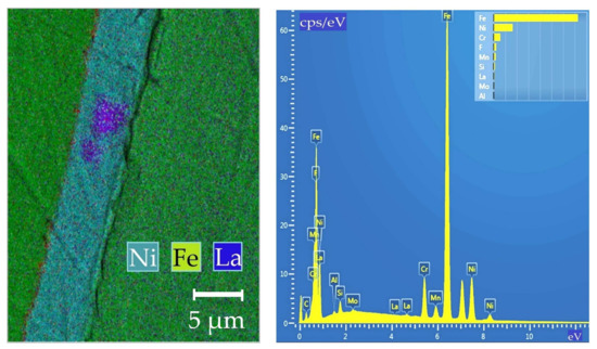 The refractory REM oxides and sulfides of type REM2O3, REM2S3 are non-metallic inclusions having a spherical shape similar to titanium oxides TiO, TiO2, Ti2O3 [13,14]. The oxides and sulfides of REMs have high melting temperatures, °C: La2O3 (2304); Y2O3 (2439); Ce2O3 (2250); ThO2 (3350); La2S3 (2110); Y2S3 (1925); Ce2S3 (2450); Th2S3 (2300) [15]. Thus, all these compounds formed in the weld pool increase the amount of crystallization nuclei, which contributes to the grain refinement of the microstructure and acicular ferrite nucleation [16,17]. Non-metallic spherical inclusions TiO, TiO2, Ti2O3 can also be the effective nuclei of acicular ferrite formation [18,19,20,21,22]. However, REMs have an advantage because they are more active in desulfurization and deoxidation reactions [23,24].