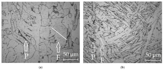 The typical microstructure of the in the weld metal center: (a) standard G3Si1 wire; (b) G3Si1 wire with Ni-LaF3 coating. The arrows indicate the grains of ferrite (F) and pearlite (P).