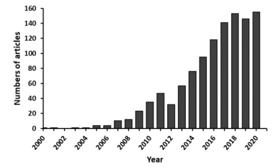 Annual publications on silk fibroin in tissue regeneration since 2000–2020. The search engine was Web of Science. “Silk fibroin” and “tissue regeneration” were applied as the terms for searching.