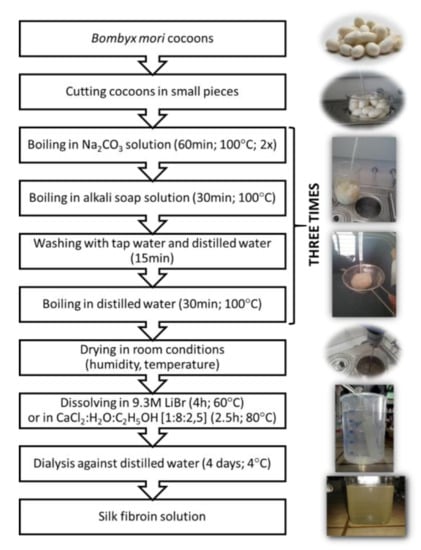 Mulberry silkworm (Bombyx mori) is the major producer of silk throughout the world [37]. Thanks to the well-established sericulture process, about 400,000 tons of dry silkworm Bombyx mori cocoons are available worldwide per annum for the textile industry and thus for applications in the biomedical field [34]. The raw silk fiber forming a Bombyx mori cocoon is composed of fibroin (75–83%) and sericin (17–25%). Fibroin is a core of two fibers with 10 to 25 µm in diameter, coated with sericin, acting as glue, that holds fibroin fibers together. Silk fibroin fibers consist of two proteins which are present in a 1:1 ratio and linked by a single disulfide bond (light and heavy chain: ~26 kDa and ~390 kDa, respectively) [14,34,37]. Sericin is capable of causing allergic and immunologic reactions in humans [34,37]. Sericin has to be removed by the de-gumming process through boiling in water, soap, or acid treatments [37,38]. Silk fibroin is mainly made of repeatable sequences of amino acids, such as serine (12%), alanine (30%), and glycine (43%) [39,40]. It can arrange itself into two structural conformations: silk I (α-helix) and silk II (β-sheets) [40]. Silk I can be soluble in water, but silk II can be dissolved using only aqueous inorganic salt (LiBr, LiSCN) or concentrated acids. It is because those solutions have the ability to break hydrogen bonds stabilizing a β-sheets silk fibroin structure [41,42,43]. The preparation process of silk fibroin from Bombyx mori cocoons is shown in Figure 2. The procedure is similar as in Q. Lu, et al. [37,44] with small modifications. First, the cocoons have to be boiled in a Na2CO3 aqueous solution (60 min; 100 °C; two times). Then, the cocoons have to be boiled in an alkaline soap solution (30 min; 100 °C), washed in tap and distilled water, and boiled in distilled water (20 min; 100 °C). This procedure must be repeated three times. Subsequently, the degummed silk is dried at room temperature and humidity for 48 h. Regenerated silk fibroin can be dissolved in an appropriate solvent system, such as 9.3 M lithium bromide, lithium thiocyanate aqueous solution, Ajisawa’s reagent (CaCl2:H2O:C2H5OH; 1:8:2.5 molar ratio), N-methyl morpholine-N oxide, calcium nitrate aqueous solution, hexafluoroisopropanol (HFIP), and ionic liquids. The time and temperature of this process depend on the solvent and solubility power of the solvent [23]. After that, dissolved silk fibroin solution can be dialyzed against pure, distilled water, and the aqueous solution of silk fibroin is obtained [37].